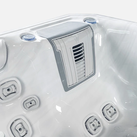 The LightSide™ cabinet system appears in PeakLife spas, which includes hidden lighting under the corner elements, and an in-house developed LED strip, which runs along the side cover of the hot tub.